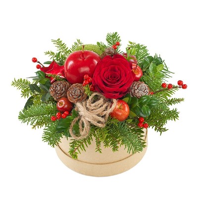 Ønsk en, du holder af, en glædelig jul med denne charmerende æske fyldt med sæsonens blomster. En julet rød rose sammen med ilexbær og julede dekorationer på en bund af vinterens grønne. Arrangementet er et eksklusivt floristhåndværk, og planterne er nøje udvalgt for at sikre høj kvalitet. Hvert arrangement er unikt og skabes ud fra sortiment og sæson – men bevarer altid sin farve og form. Leveres af en lokal florist.