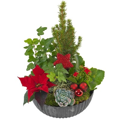 Klassisk julegruppe fyldt med sæsonens smukkeste blomster. Med julestjerne, husløg og vedbend, dekoreret med røde julekugler, bliver det den perfekte julegave. Arrangementet er et eksklusivt floristhåndværk, og planterne er nøje udvalgt for at sikre høj kvalitet. Hvert arrangement er unikt og skabes ud fra sortiment og sæson – men bevarer altid sin farve og form. Leveres af en lokal florist.
